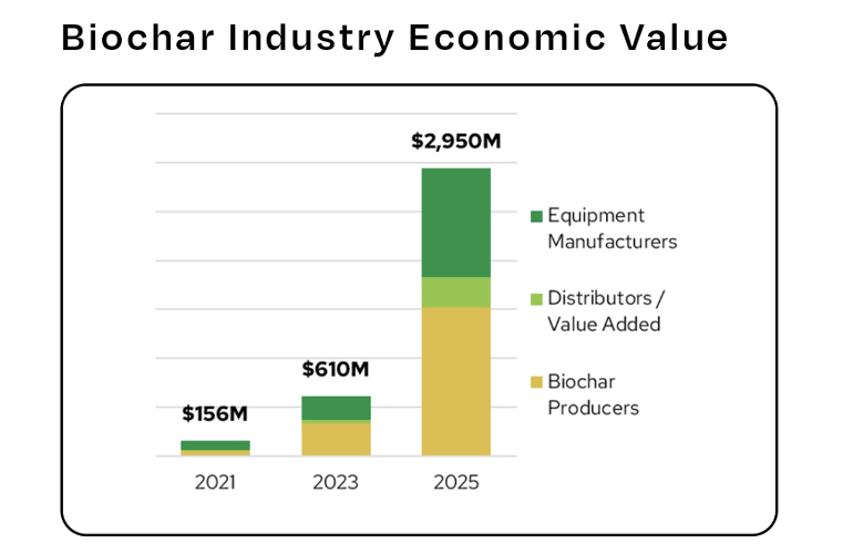 - Economic growth: From an economic perspective revenues from biochar producers, distributors, value-added producers, and equipment manufacturers exceeded US$600 million in 2023, with a CAGR of 97 percent between 2021 and 2023. Revenues are projected to grow further to nearly US$3.3 billion by 2025.