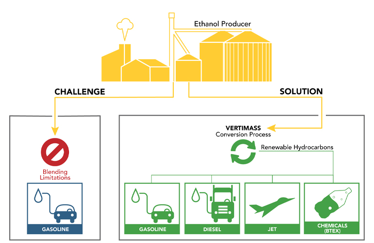 Vertimass is developing a unique Consolidated Alcohol Deoxygenation and Oligomerization (CADO) technology to allow ethanol producers to produce SAF and diesel blendstocks that are compatible with the current transportation fuel infrastructure as well as LPG, mainly propane and butane.
