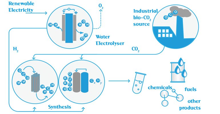 The pilot plant consists of integrated mobile containers: a unit for processing CO2, a hydrogen production unit and a synthesis unit for turning the CO2 and the hydrogen into liquid and solid hydrocarbons.