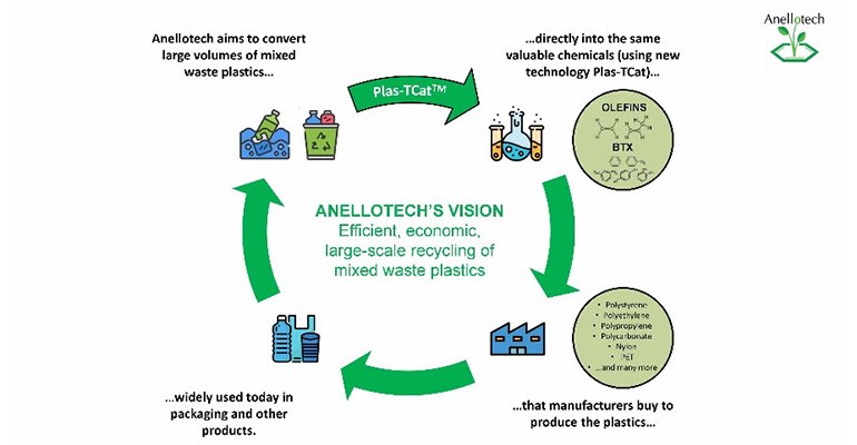 Anellotech is leveraging and adapting its process technology for Plas-TCat, which will convert mixed plastic waste feedstocks, including composite films and other difficult-to-recycle materials, at industrial scale into the same basic chemicals (aromatics and olefins) already used to make most virgin plastics, including PET.